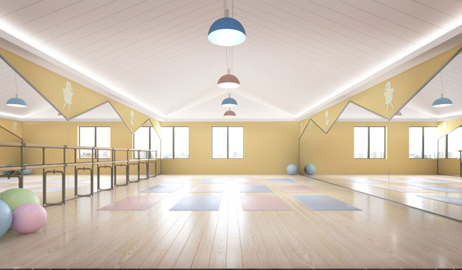 衛生(shēng)間(jiān)設計(jì)實用(yòng)又(yòuβ•→σ)有(yǒu)趣,彩色吊燈搭配可(kě)愛(ài)小(xiǎo)便池,增添活潑感。★舞(wǔ)蹈室以黃(huáng)色為(wèi)主色調,© §安裝鏡子(zǐ)和(hé)把杆,配備彩色瑜伽墊和(hé)健身(shēn)球,滿足運動< 需求。