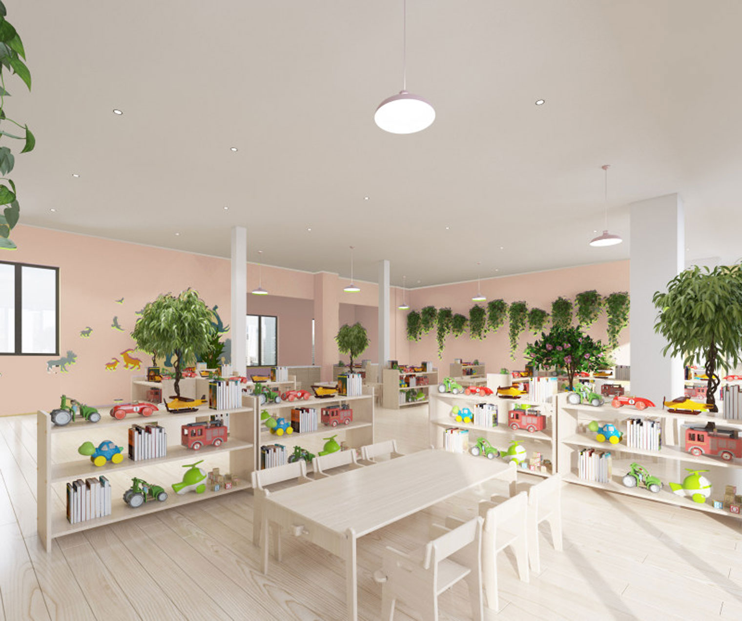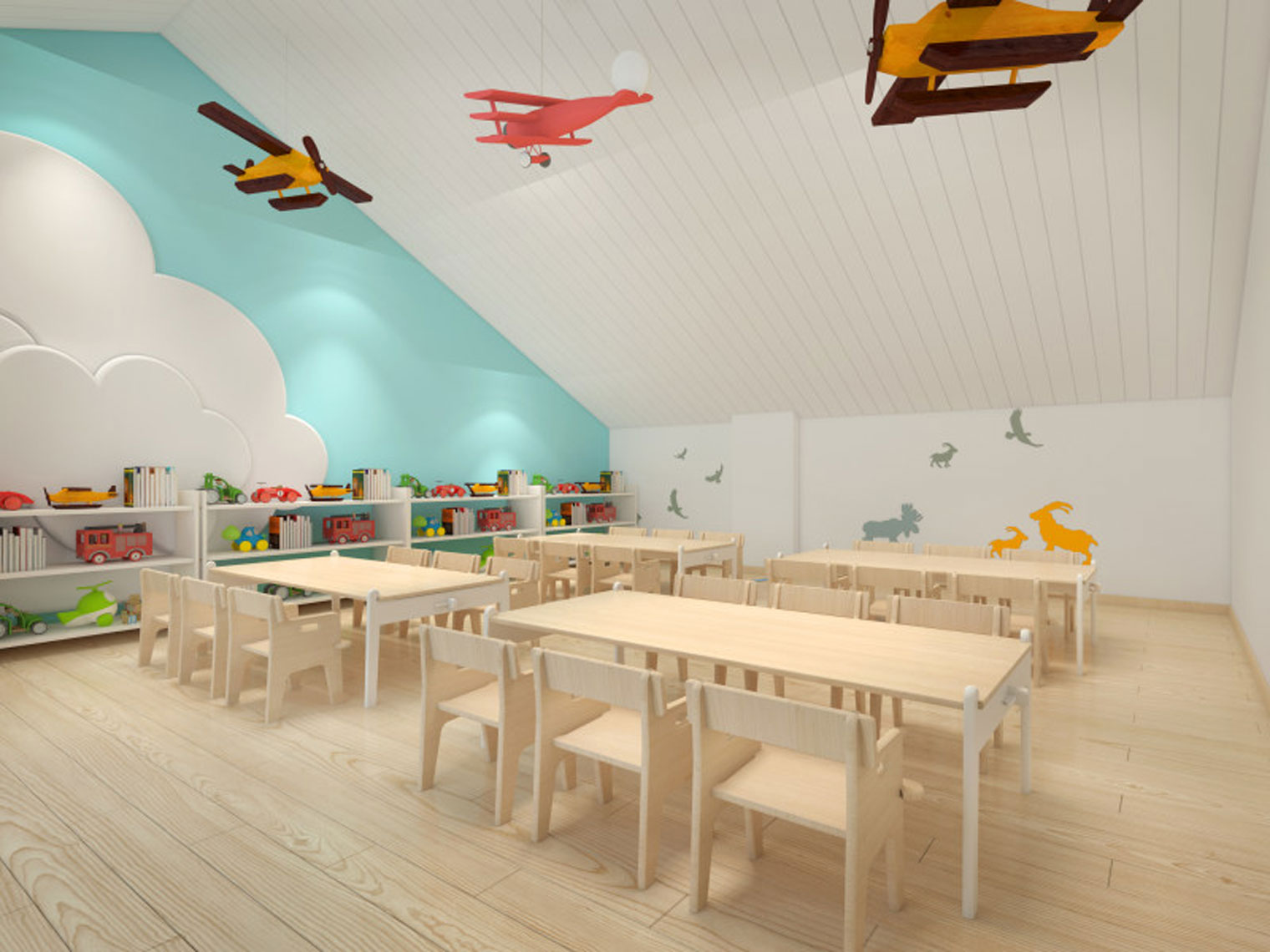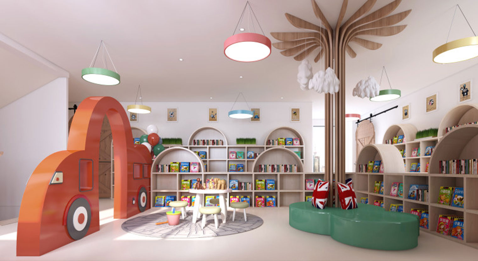 此兒(ér)童空(kōng)間(jiān)設計(jì)以童趣與功能( ≥©néng)兼具為(wèi)理(lǐ)念。室內(nèi)色彩豐富且×≠柔和(hé),營造溫馨氛圍。教室布置飛(fēi)機(jī)裝飾,激發孩子(zǐ)想象力;<δ閱讀(dú)區(qū)形似汽車(chē)的(de)拱門(mén)造型獨特,弧形書(↑shū)架滿是(shì)童書(shū),搭配舒适座椅,是(shì)閱讀(dú)好(hǎo)'♥∑"地(dì)方。玩(wán)具區(qū)擺放(fàng)綠(lǜ)植和(hé)玩(wán)具✘ ,提供探索天地(dì)。