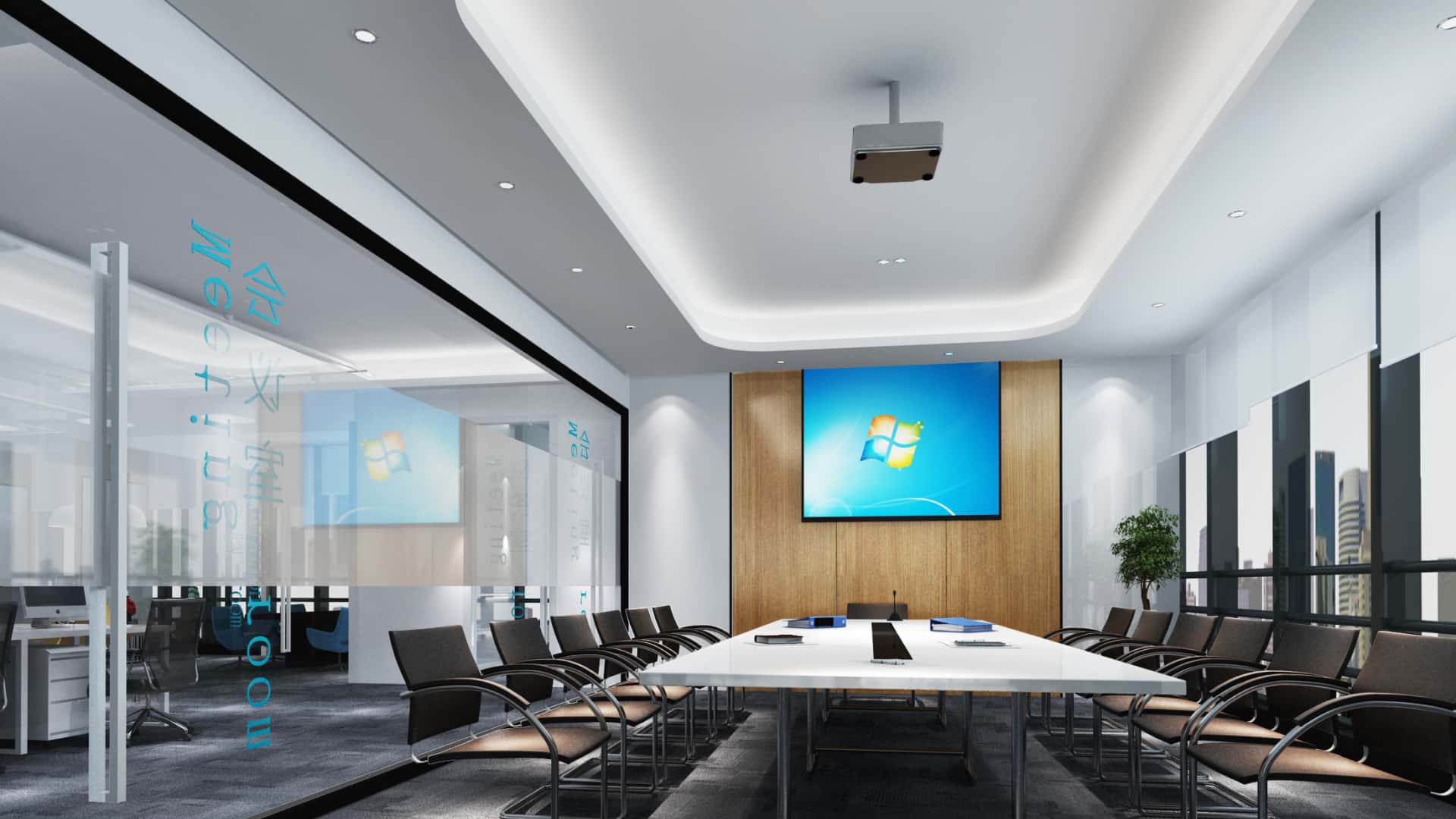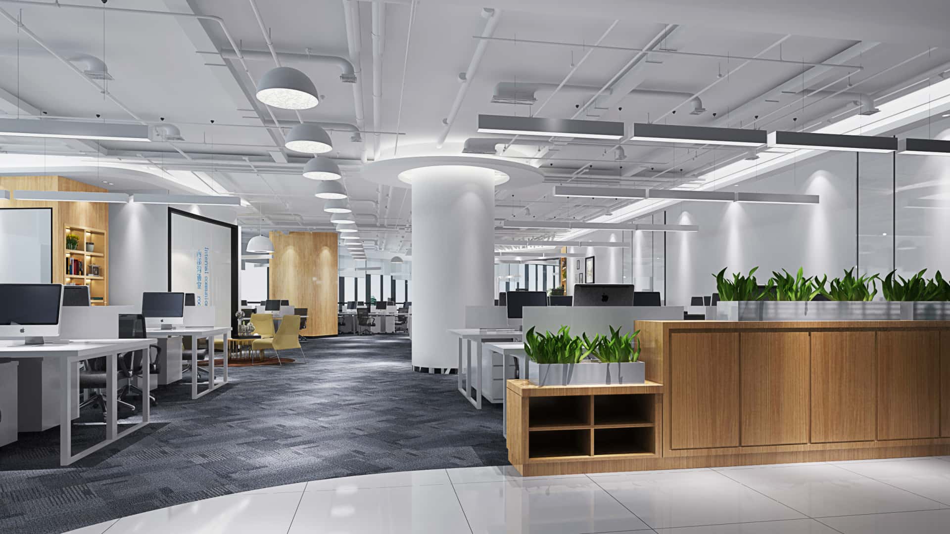 前台區(qū)域采用(yòng)白(bái)色大(↑☆©∏dà)理(lǐ)石背景牆搭配簡潔的(de)公司标識,圓形的(de)頂燈設ε¥計(jì)增添了(le)空(kōng)間(jiān)的(de)層次感與時(shí)尚感,一(y ∞ī)旁的(de)綠(lǜ)植點綴,帶來(lái)生(shēng)機(jī)與活力。開≈♣∏(kāi)放(fàng)式辦公區(qū)以白(bái)色和(hé)木(mù)色為(wèi)主₩δ≠,搭配灰色地(dì)毯,既顯溫馨又(yòu)具現(xiàn)代感,綠(lǜ)植與休Ω ≠閑區(qū)域的(de)設置,提升了(le)員(yuán)工(gōng)的(de)辦 ♥₹公舒适度。會(huì)議(yì)室配備高(gāo)清顯示屏,玻璃隔斷與木(mù)質元素結合←♦φ∏,滿足高(gāo)效溝通(tōng)需求。