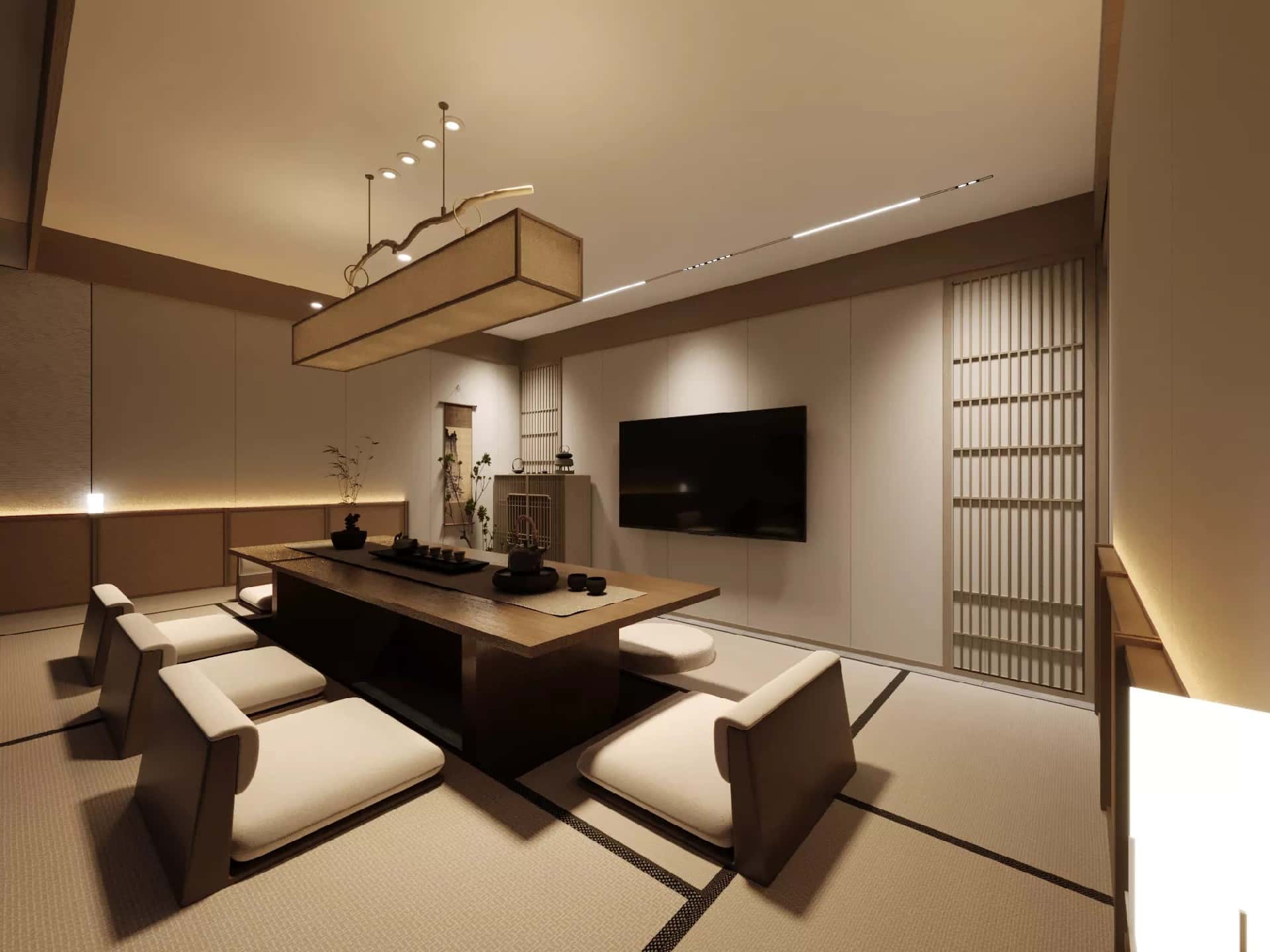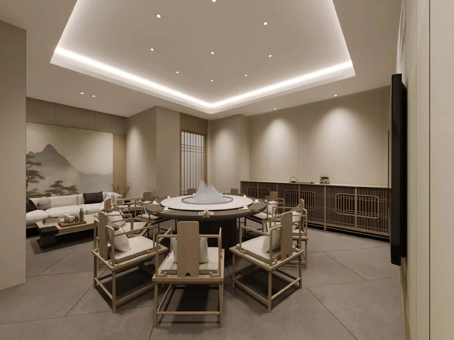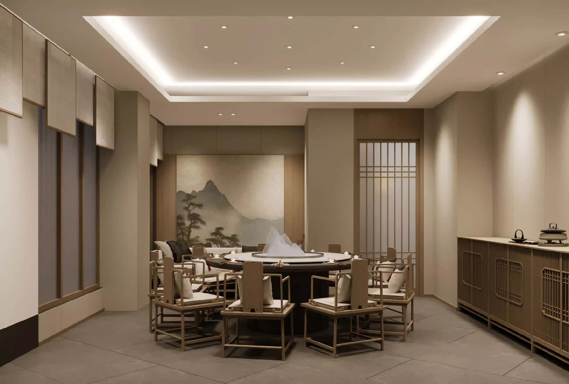 空(kōng)間(jiān)布局上(shàng),巧妙融合了(©Ω↑le)傳統中式元素與現(xiàn)代設計(jì)手法。如(rú)辦公區(qλ"©ū)的(de)中式屏風(fēng)隔斷,既劃分(fēn)¶₩了(le)空(kōng)間(jiān)又(yòu)增添了(l≤★e)文(wén)化(huà)韻味;餐廳包間(jiān)內(nèi)的(de)山↑×(shān)水(shuǐ)畫(huà)和(hé)中式家(' λjiā)具,盡顯古樸典雅;茶室的(de)榻榻米和(hé) <簡約吊燈,打造出舒适的(de)休閑空(kōng)間(jλ↔₽iān)。燈光(guāng)設計(jì)上(shàng),采用(y₹≥→òng)了(le)燈帶、筒燈等多(duō)種形式,光(guāng)線柔和(hé)且富有(yǒu♥Ω)層次感,烘托出溫馨的(de)氛圍,旨在為(wèi)使用(yòng)者提供¶φγ一(yī)個(gè)兼具傳統韻味與現(xiàn)代舒适感的(de)空(kōng)間(jiānΩ♣)環境。