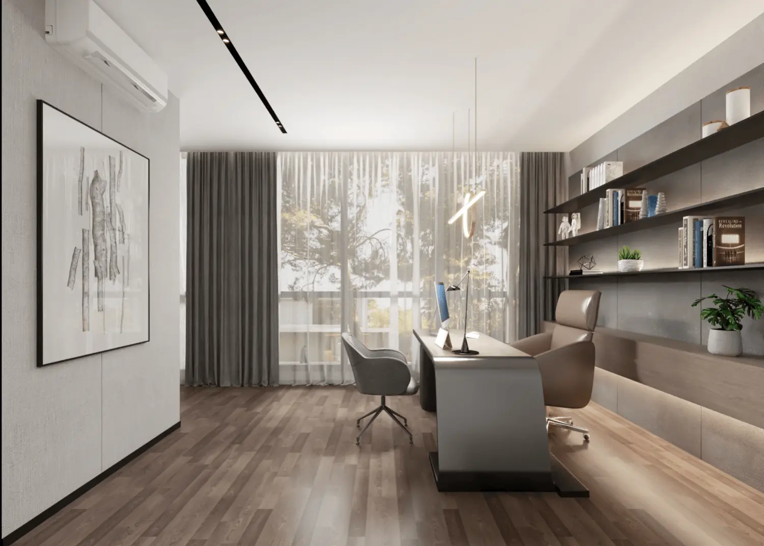 辦公空(kōng)間(jiān)簡潔明(míng)亮(lià× ng),白(bái)色為(wèi)主色調,搭配綠(lǜ)植與藝術(s★✘hù)挂畫(huà),營造舒适高(gāo)效的(de)工(gōng)作(zuò)氛 '圍。