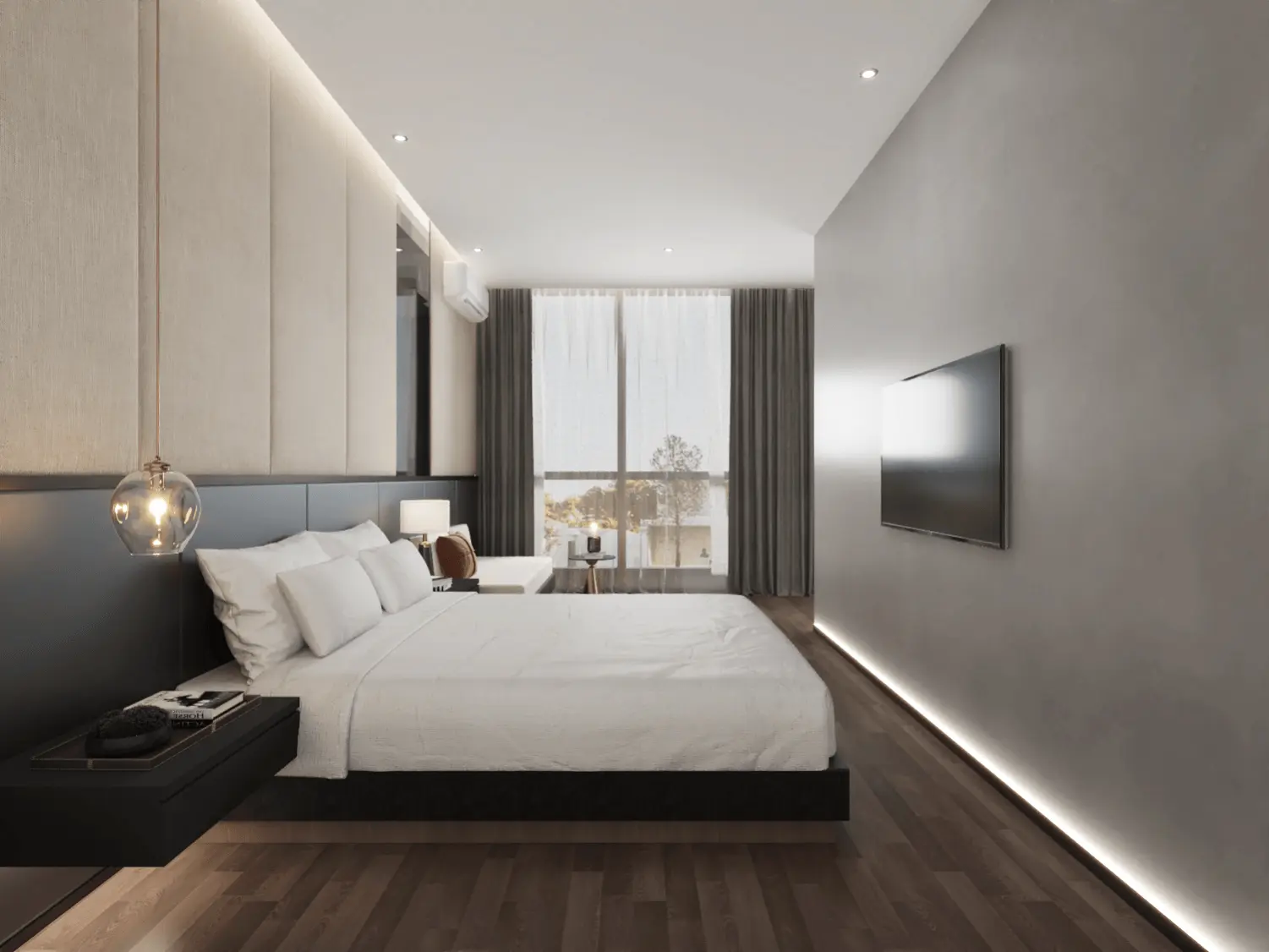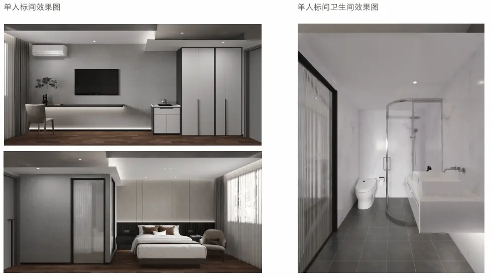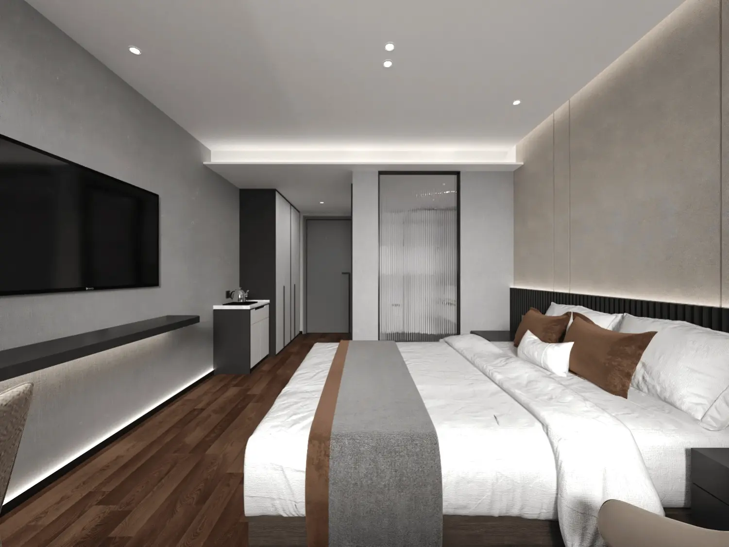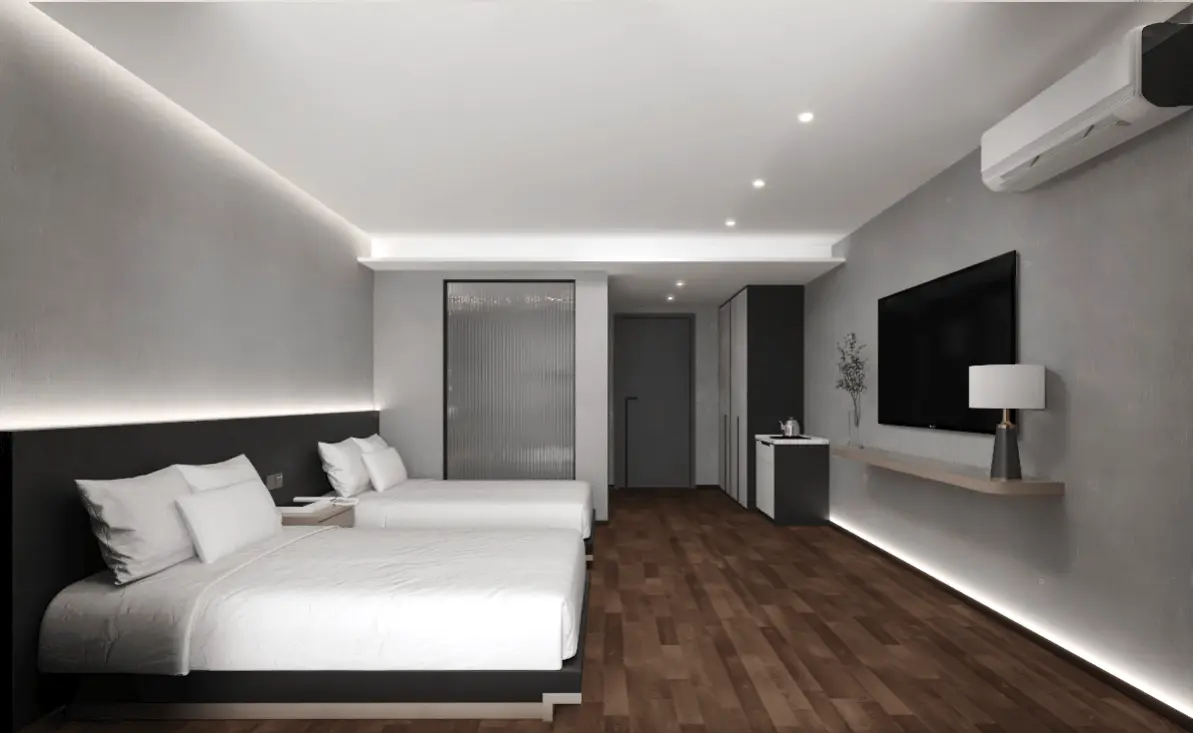 酒店(diàn)客房(fáng)以灰白(bái)黑(hēi φ ₹)為(wèi)主,木(mù)質地(dì)闆增添溫馨,燈光(guāng)設計 ↕(jì)柔和(hé),注重細節與質感,打造靜(jìng)谧休憩空(kō"λ"÷ng)間(jiān)。