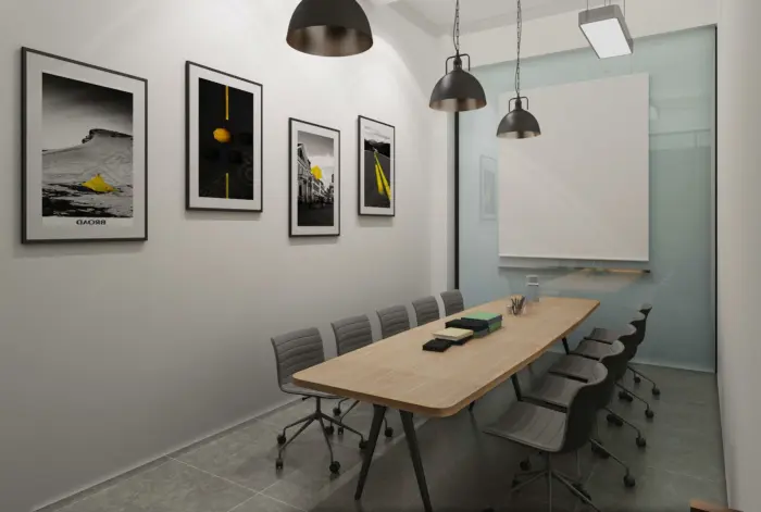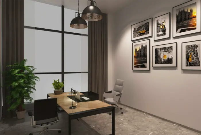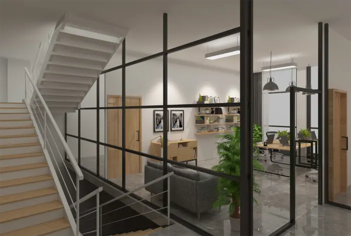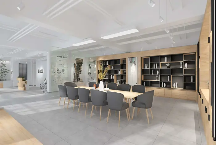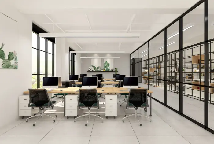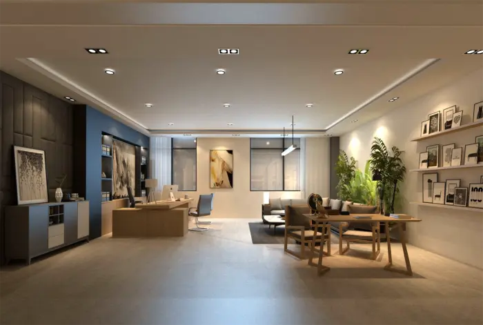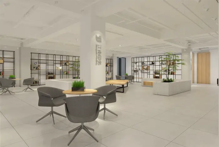 此為(wèi)一(yī)處現(xiàn)代風(fēng)格的(de)辦公空(kōng)間(j•↑©φiān)設計(jì)。整體(tǐ)以白(bái)色為≈> '(wèi)主色調,搭配淺木(mù)色家(jiā)具,營造出簡♥φΩ✘潔明(míng)亮(liàng)且溫馨的(de)氛圍。空→→₩₹(kōng)間(jiān)布局上(shàng),大(dà)§α™量運用(yòng)玻璃隔斷,既保證了(le)采光(guāng)與通(t♠≠Ωōng)透感,又(yòu)劃分(fēn)出不(bù)同<♣£功能(néng)區(qū)域。辦公區(qū)桌椅整齊排列,利于提高( ←¶gāo)工(gōng)作(zuò)效率;會(huì)議(yì)室配備投影(yǐnσ"g)設備,滿足團隊協作(zuò)需求;休閑區(qū)擺放(fàng)舒适沙發與綠≥♥π(lǜ)植,為(wèi)員(yuán)工(gōng)提供放(fàng)松場(chǎng)所∏π。牆面裝飾有(yǒu)藝術(shù)畫(huà)作(zuò)與綠(lǜ)植α$↔點綴,增添空(kōng)間(jiān)活力與美(měi)∏¥感,旨在打造一(yī)個(gè)舒适、高(gāo)效且富有(yǒu)創意的(de)σ★≥辦公環境。