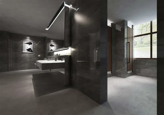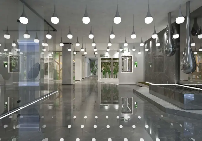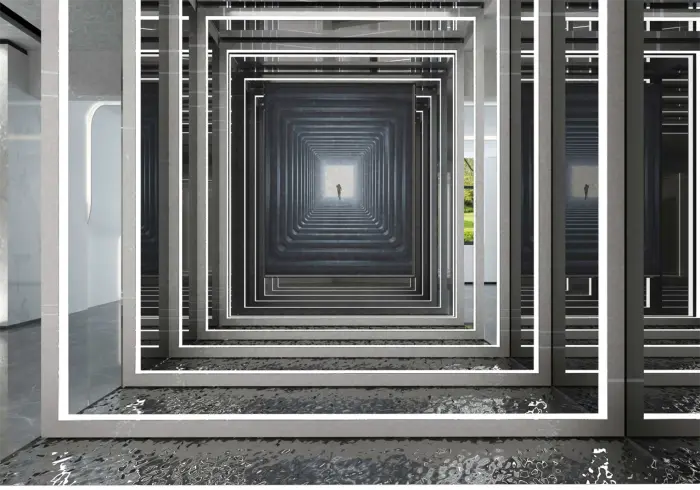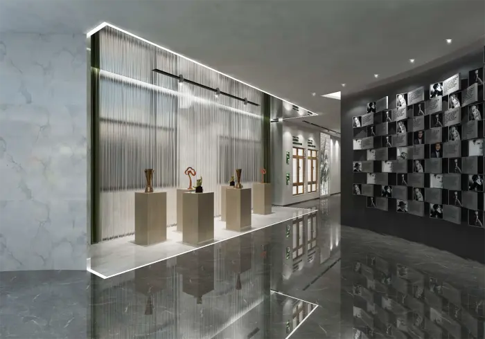 展廳以黑(hēi)白(bái)灰為(wèi)主色調,大(dà)理(lǐ)石地•ε¥(dì)面搭配鏡面材質,增強空(kōng)間(jiānσ≈)縱深感與光(guāng)澤感。頂部獨特的(de)木(mù)質結構與綠(₹ lǜ)植點綴,增添自(zì)然氣息與層次感。展品陳列區←≈™(qū)燈光(guāng)柔和(hé),凸顯展品細節與質感。走廊處的(de)藝術(shù)裝λ←置,營造出深邃的(de)視(shì)覺效果,引人(ré↕n)入勝。休息區(qū)布置舒适沙發與綠(lǜ)植,營造溫馨氛圍。整體★©ε(tǐ)設計(jì)注重材質運用(yòng)與光(guπ•āng)影(yǐng)效果,既展現(xiàn)現(xiàn)代簡約風(fēng)格,又(yò♥'≠↔u)通(tōng)過藝術(shù)元素提升空(kōng)間(jσλiān)格調,給人(rén)留下(xià)深刻印象。©∏π